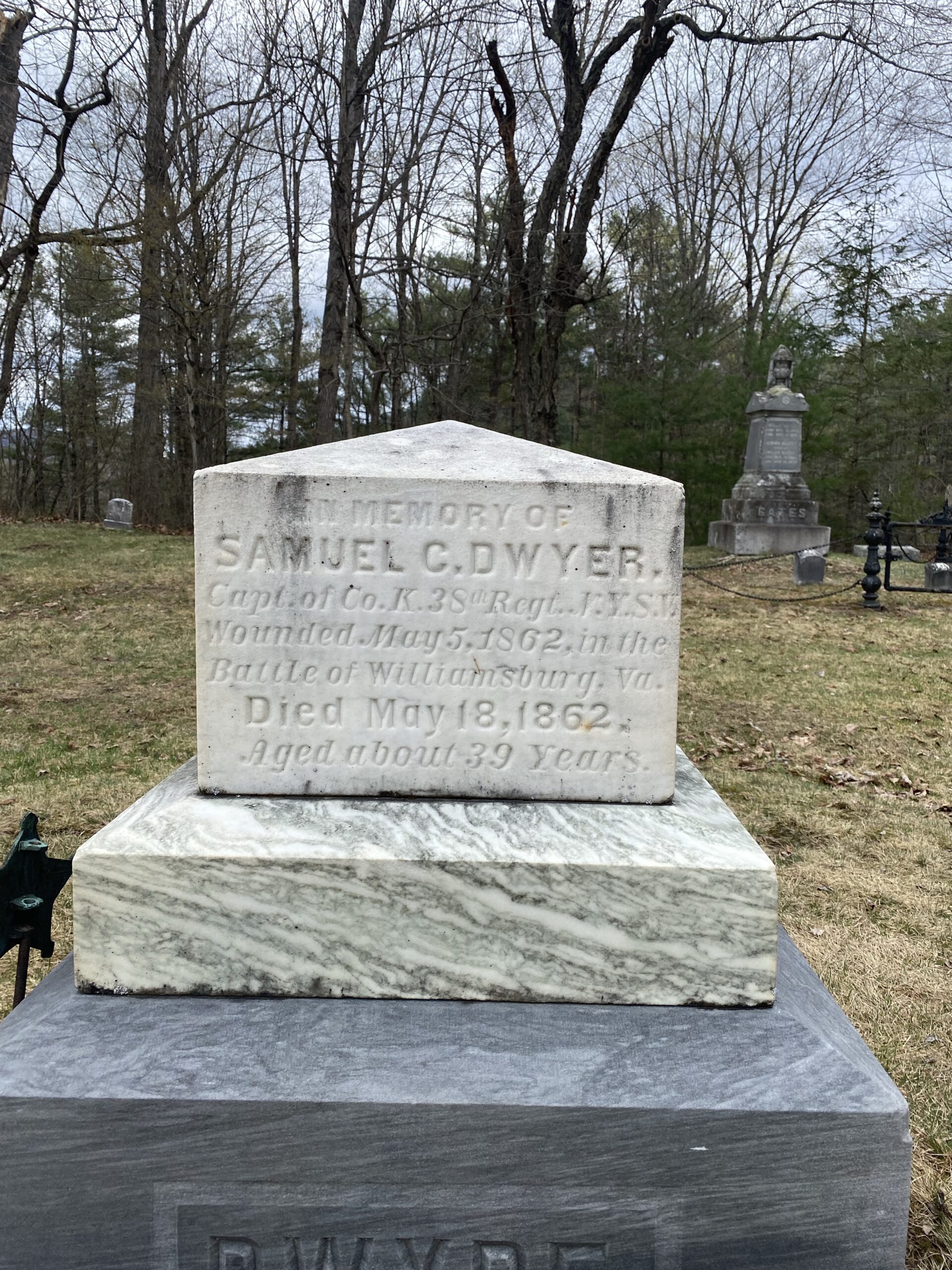 The first headstone I saw was a short white marble plinth placed in the center of a path through the cemetery, so you approached it when entering one part of the cemetery and see it in front of you. After you read how Samuel Dwyer lived and died, you come to the back of his memorial.